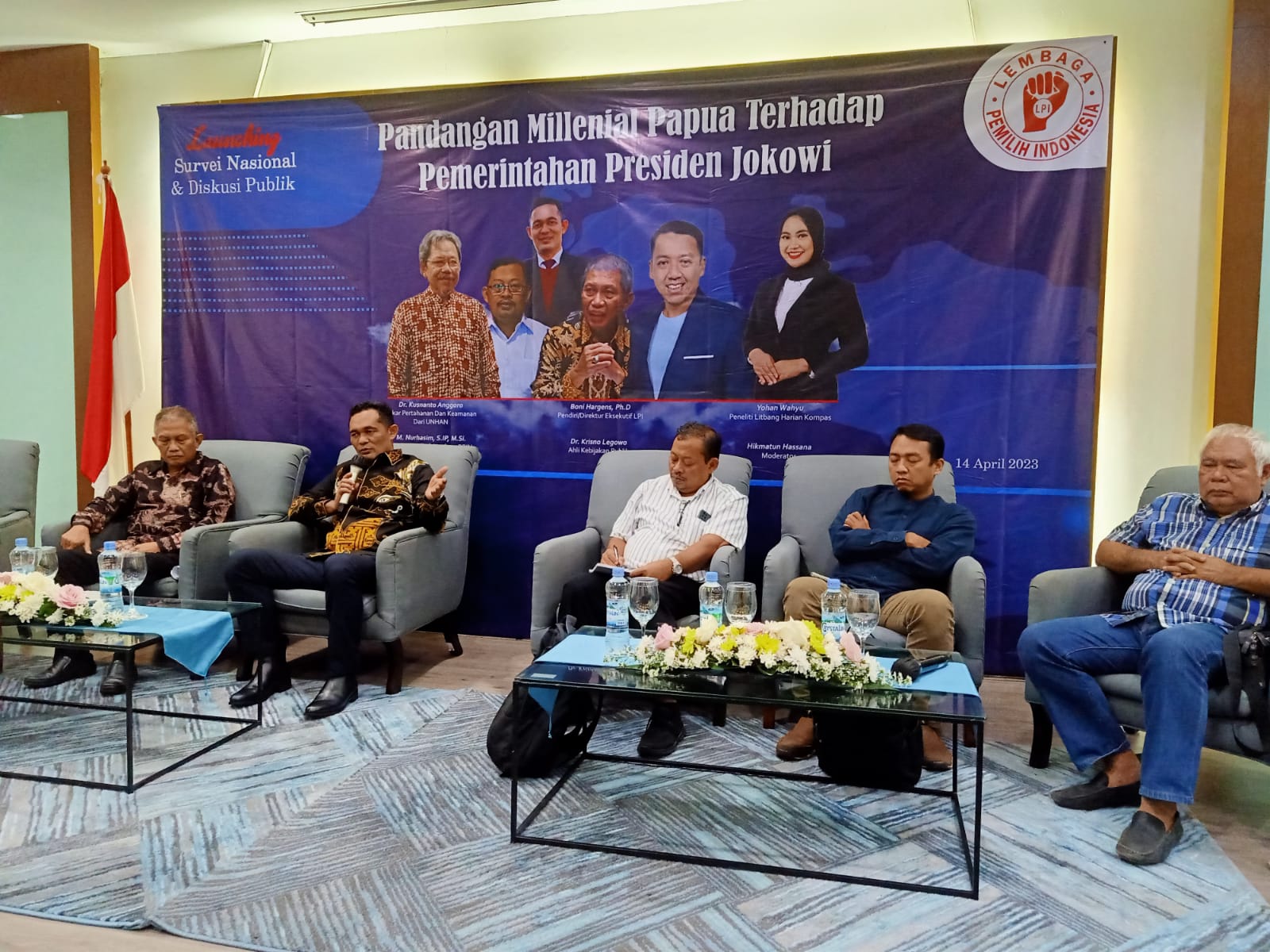Sejumlah narasumber pada launching Survei Nasional dan Diskusi Publik bertajuk ‘Pandangan Milenial Papua terhadap Pemerintahan Presiden Jokowi’ di Hotel Aryaduta, Semanggi, Jakarta, Jumat (14/4/2023) | IST