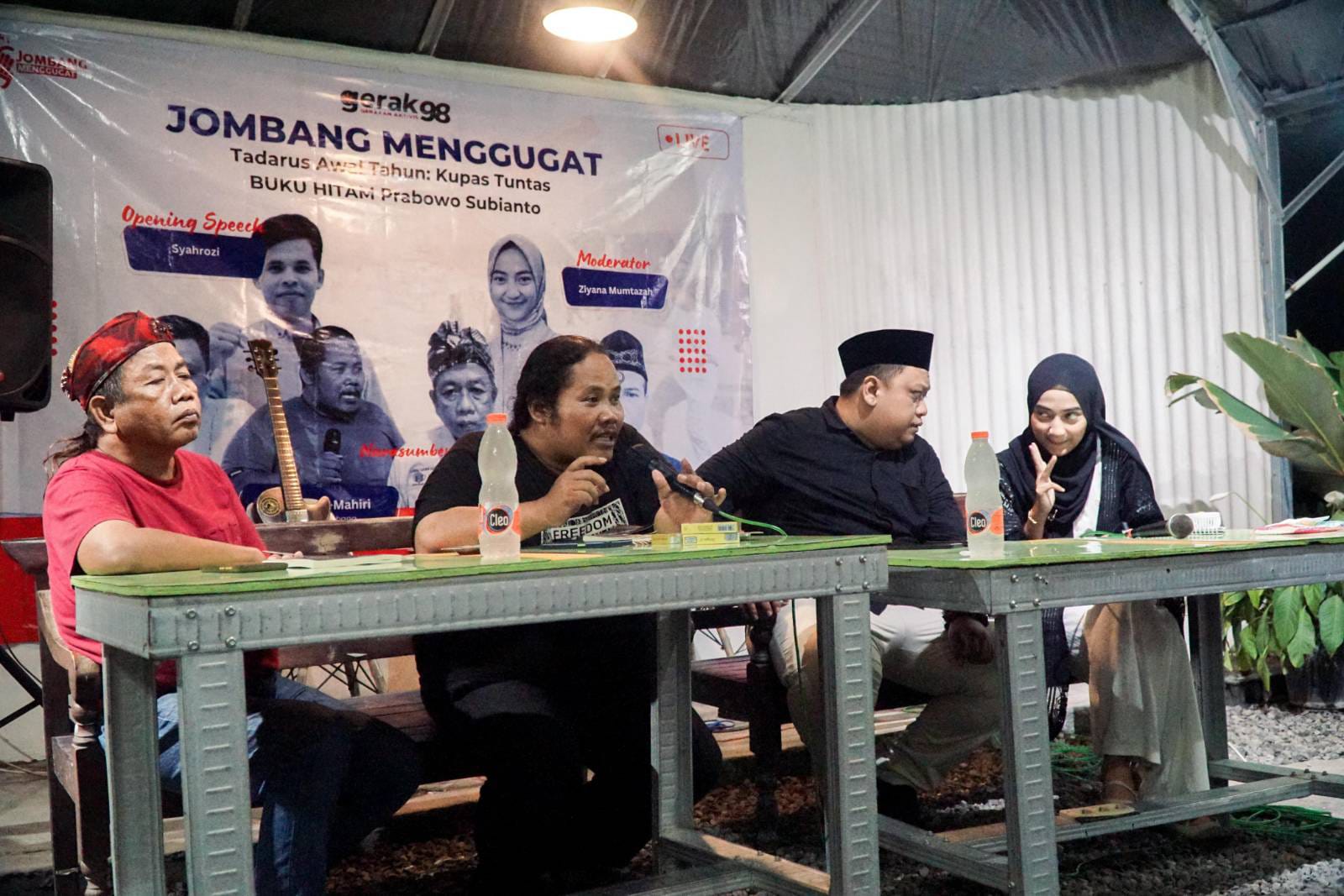HARNAS.CO.ID – Sejumlah Kelompok Gerakan Jombang Menggugat bersama Gerak 98 menggelar Tadarus Awal Tahun Kupas Tuntas Buku Hitam Prabowo Subianto, Sejarah Kelam Reformasi 98. Bedah buku itu dilangsungkan di Warkop Lakabudi Kabupaten Jombang Jawa Timur, Selasa (16/1/2024).