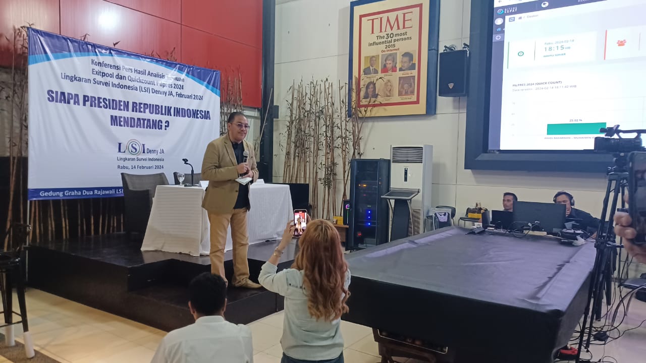 Pada 14 Februari 2024, LSI Denny JA telah melaksanakan quick count hasil Pilpres 2024 bekerja sama dengan TVOne dan sejumlah stasiun TV nasional lainnya. Ketika data masuk quick count LSI telah mencapai 100 persen, pasangan Prabowo-Gibran memperoleh 58,47 persen suara, diikuti pasangan Anies-Muhaimin yaitu 24,98 persen dan pasangan Ganjar-Mahfud MD sebanyak 16,55 persen.