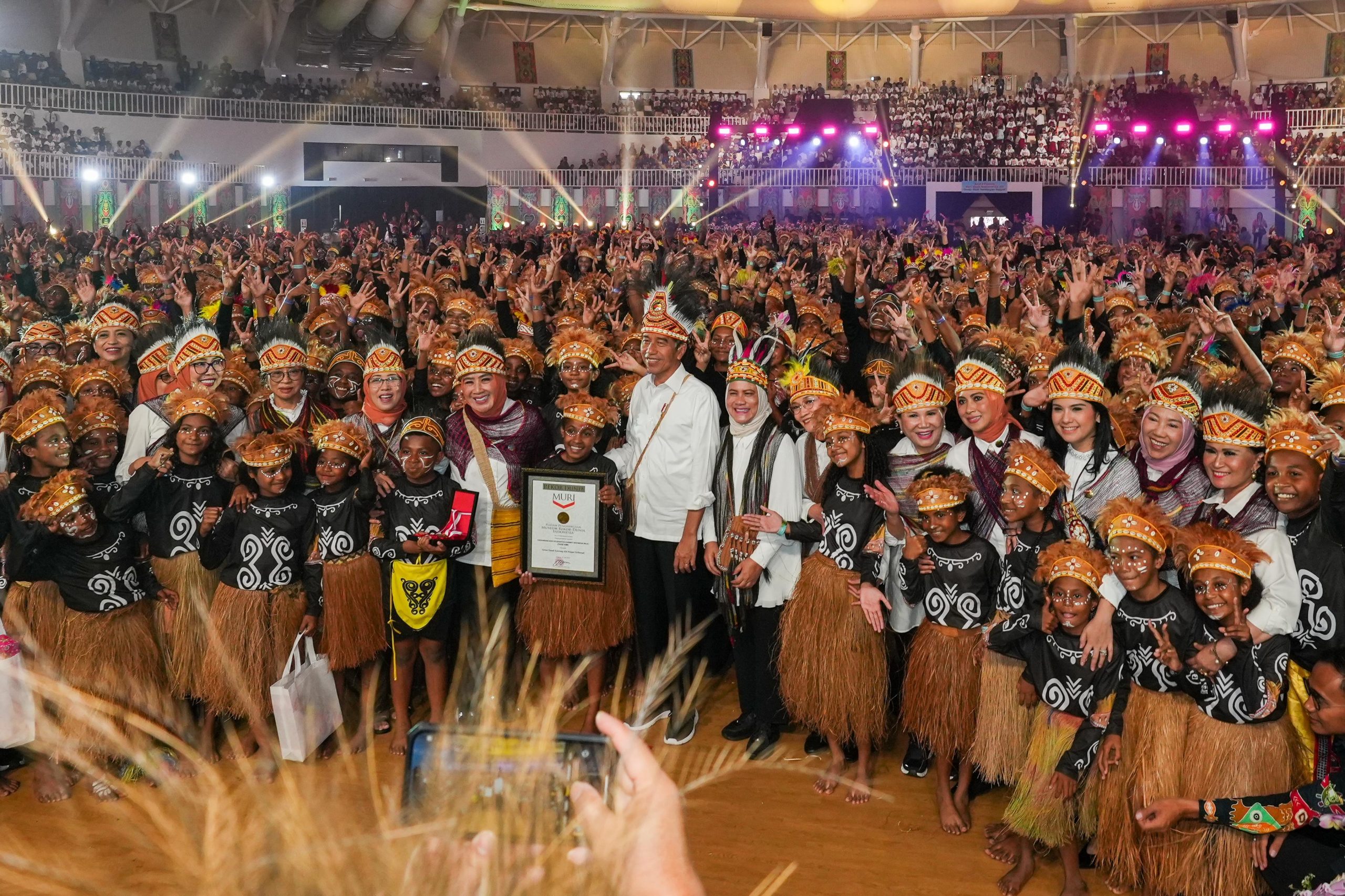 HARNAS.CO.ID – Sebanyak 2.600 anak berhasil mencetak Rekor Museum Rekor Dunia Indonesia (MURI) kategori anak-anak menari terbanyak yang diiringi musik dan lagu medley Papua. Tarian ini menjadi penutup puncak Hari Anak Nasional (HAN) Tahun 2024 yang berlangsung di Istora Papua Bangkit, Kota Jayapura, Papua, Selasa (23/7/2024). Mereka tampil di hadapan Presiden Joko Widodo (Jokowi), Ibu Negara Iriana, dan sejumlah pejabat terkait yang hadir.