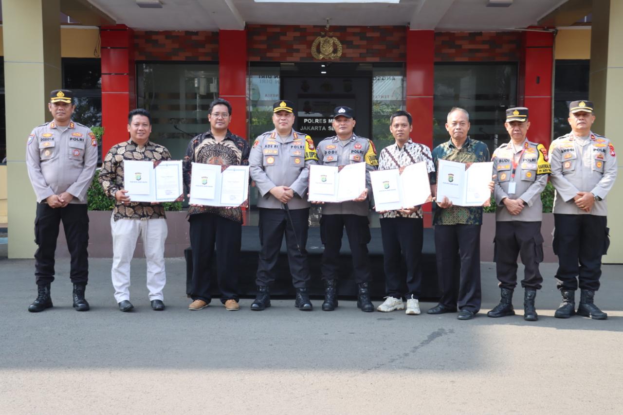 Kapolres Metro Jaksel Kombes Pol Ade Rahmat Idnal (keempat dari kiri) bersama Bhabinkamtibmas Kelurahan Ragunan, Aiptu Dody Edi Sudrajat (kelima dari kanan) dan empat orang warga Kelurahan Ragunan usai pemberian penghargaan di Mapolres, Jaksel, Kamis (17/10/2024). (Foto: Istimewa)