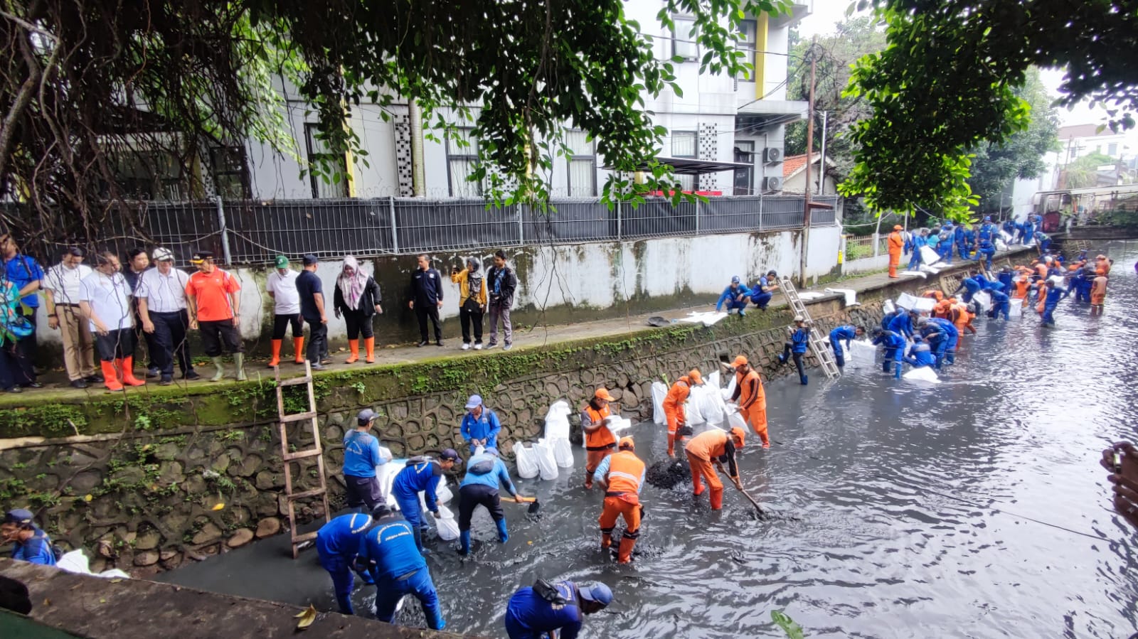 Terpantau, ratusan personel “pasukan biru” dari Sudin SDA Jaksel serta tiga alat berat dikerahkan mempercepat pembersihan sedimen lumpur dan sampah dari badan kali.